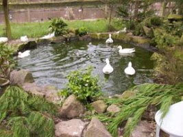 To provide shade and colour the inside was planted with non poisonous (no berries) evergreen shrubs, primroses in the rockeries for spring and pansies for summer. Other plants in pots are placed inside according to the season. The whole of the ground area is covered in pea shingle which is free draining, easily washed down with a garden hose and raked out to maintain cleanliness. The ducks find this very comfortable underfoot.